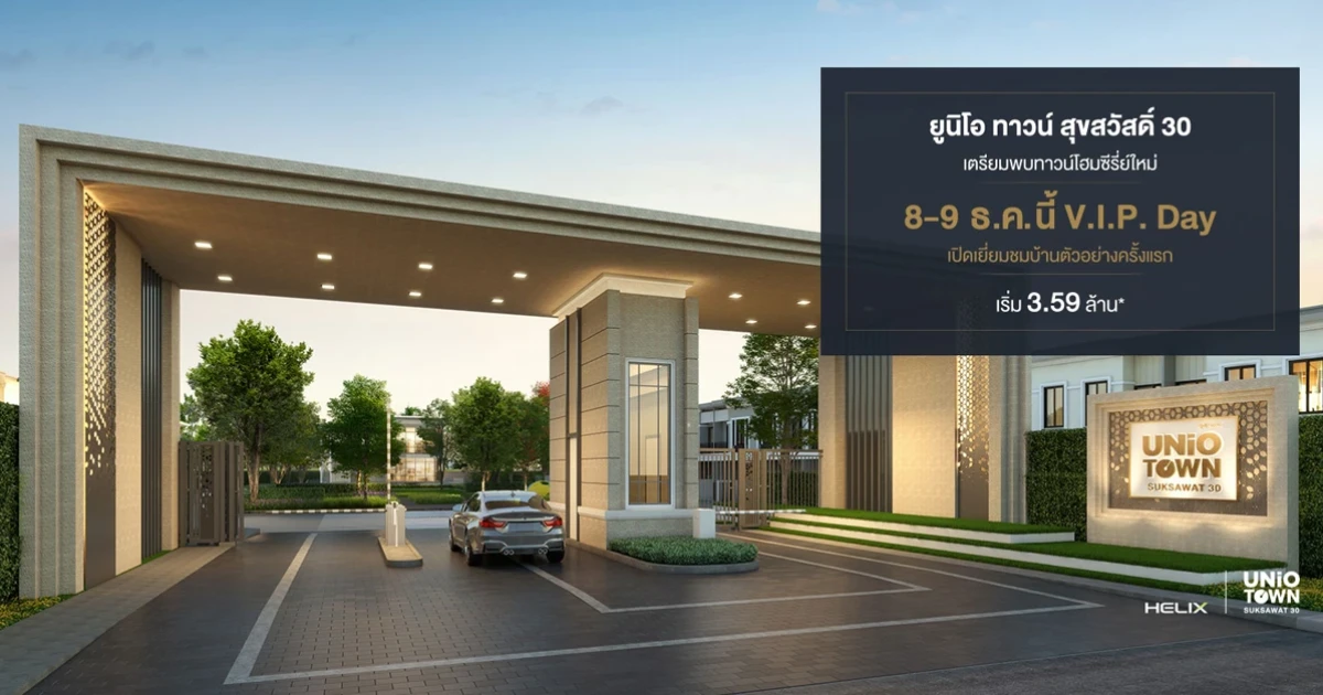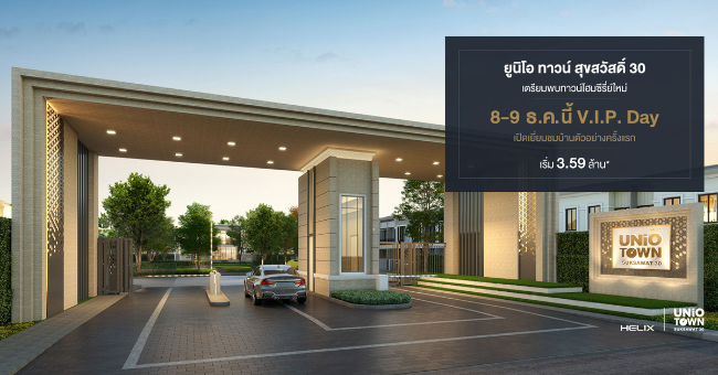 "ยูนิโอ ทาวน์ สุขสวัสดิ์ 30" เปิดชมบ้าน V.I.P Day 8-9 ธ.ค. นี้ เริ่ม 3.59 ลบ.* ลงทะเบียนรับสิทธิพิเศษ