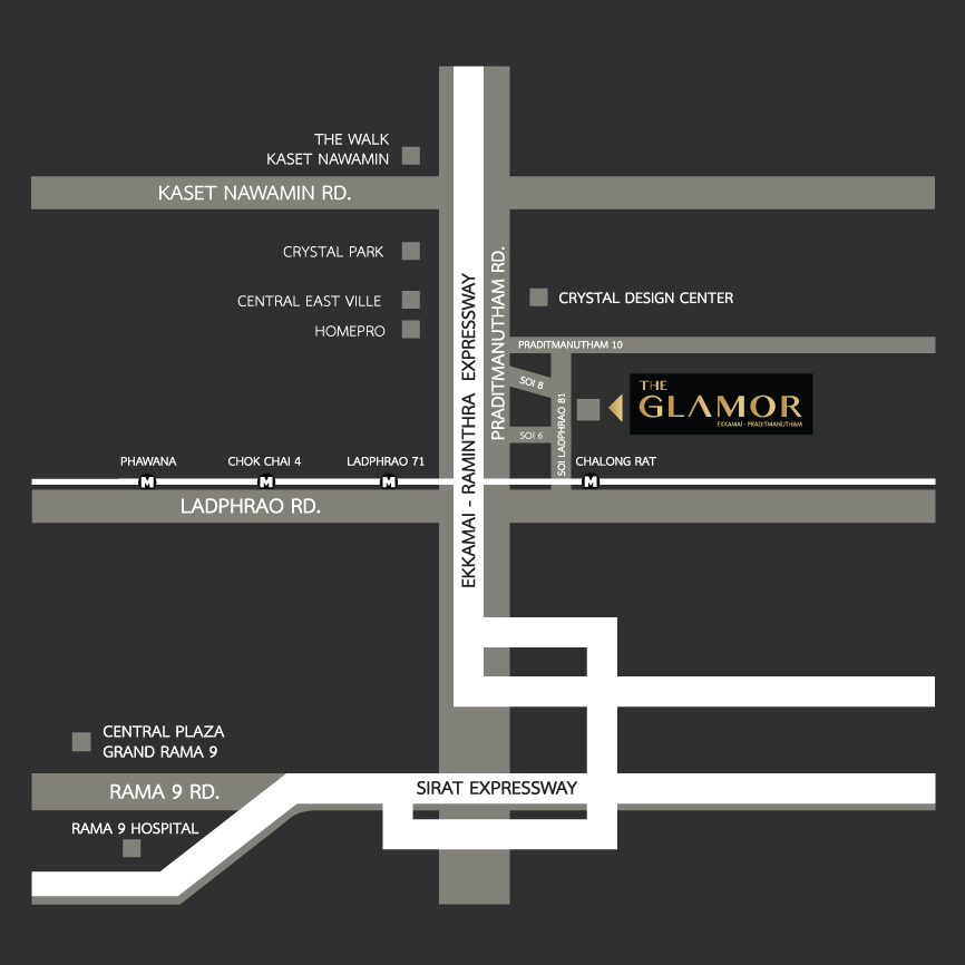 โครงการตั้งอยู่ซอย 8 ถนนประดิษฐ์มนูธรรม แขวงคลองเจ้าคุณสิงห์ เขตวังทองหลาง กรุงเทพมหานคร 10310 ถนนเส้นสำคัญที่ล้อมรอบไปด้วยจุดหมายมากมายจากย่านธุรกิจของกรุงเทพฯ ที่ห่างจากเราเพียงไม่กี่นาที
