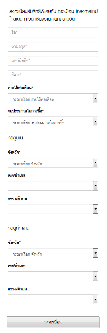 โกลเด้นแลนด์ เปิดให้จองโครงการใหม่ โกลเด้น ทาวน์ เชียงราย-บิ๊กซีแยกสนามบิน (Golden Town Chiangrai - Big C Yaek Sanambin) เตรียมพบ อาณาจักรใหม่ GOLDEN EMPIRE บ้านโครงการใหม่ บ้านล้อมทะเลสาบ สะดวก ติดถนนใหญ่ ใกล้สนามบิน หนึ่งเดียวในเชียงราย ท่านที่สนใจสามารถลงทะเบียนจอง เพื่อรับส่วนลดพิ่ม 20,000 บาท* ได้ที่เว็บไซต์ของโกลเด้นแลนด์
