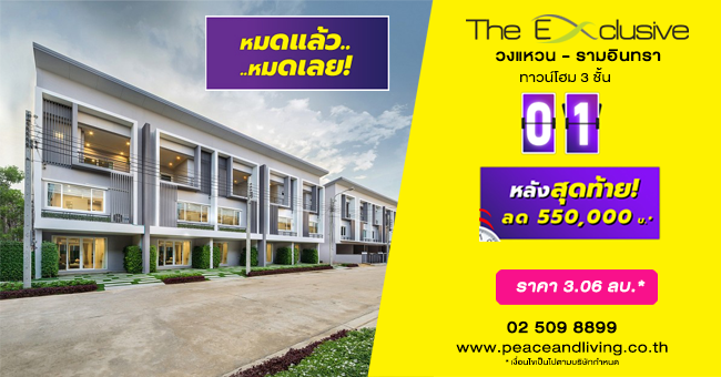 บริษัท พีซแอนด์ลีฟวิ่ง จำกัด จัดโปรโมชั่นส่งท้ายปี หมดแล้ว หมดเลย หลังมุมหลังสุดท้ายก่อนปิดโครงการ เทหมดหน้าตัก คุ้มสุดๆ ลด 550,000 บาท* กับโครงการ "ดิ เอ็กซ์คลูซีฟ วงแหวน - รามอินทรา" ทาวน์โฮม 3 ชั้น พร้อมสวนใหญ่ สระว่ายน้ำกว้าง ฟิตเนส และสนามเด็กเล่น