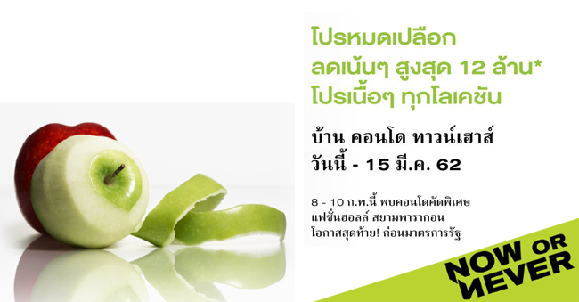 โปรโมชั่น: โปรหมดเปลือก ลดเน้นๆ สูงสุด 12 ล้าน* โปรเนื้อๆ ทุกโลเคชั่น บ้าน คอนโด ทาวน์เฮ้าส์ วันนี้ - 15 มีนาคม 2562 / 8 - 10 กุมภาพันธ์ นี้ พบคอนโดคัดพิเศษแฟชั่นฮอลล์ สยามพารากอน โอกาสสุดท้าย! ก่อนมาตรการรัฐ ดูเงื่อนไขและโครงการที่เข้าร่วมโปรโมชั่นได้ที่นี่