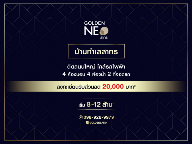 โปรโมชั่น: โกลเด้น นีโอ สาทร หลุดจอง!! แปลงสวย หน้าสวน สุดยอดทำเลศักยภาพ ย่านสาทร บนที่ดินผืนสุดท้าย ใกล้รถไฟฟ้า พบบ้าน นีโอโฮม สไตล์อังกฤษ 4 ห้องนอน 4 ห้องน้ำ พร้อมห้องพระและสวนธรรมชาติ เริ่ม 8-12 ล้าน* ลงทะเบียนล็อคคิวบ้านหลุดจองที่นี่