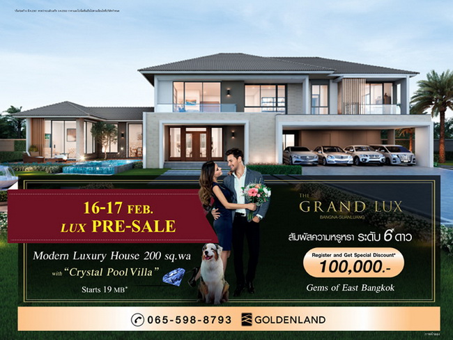 โปรโมชั่น: เดอะ แกรนด์ ลักซ์ บางนา-สวนหลวง 16-17 กุมภาพันธ์ 2562 นี้ LUX PRE-SALE พร้อมเปิดจองแล้ว! โครงการใหม่บนทำเลบางนา พบนิยามของความหรูหราระดับ 6 ดาว! THE GRAND LUX บางนา-สวนหลวง พร้อมให้คุณครอบครองได้ในราคาเริ่ม 19 ล้าน* ลงทะเบียนเพื่อรับข้อมูลและรับ Privilege Offers 100,000 บาท* ได้ที่นี่