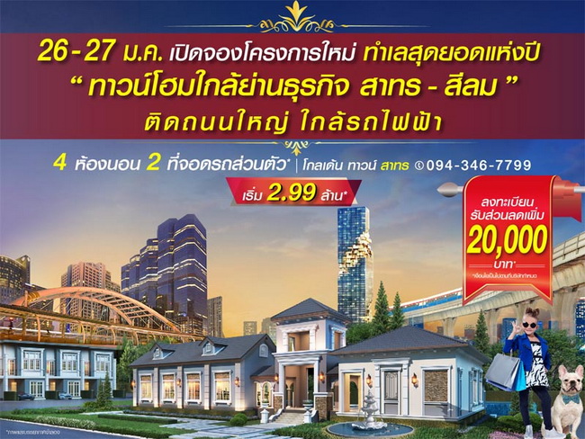โปรโมชั่น: โกลเด้น ทาวน์ สาทร #สิ้นสุดการรอคอย 26-27 มกราคม 2562 เปิดจองโครงการใหม่ ทำเลสุดยอดแห่งปี!! ทาวน์โฮมใกล้ย่านธุรกิจ สาทร-สีลม เพียง 6 กม. จากสาทร ติดถนนใหญ่ ใกล้รถไฟฟ้า เริ่มต้นเพียง 2.99 ล้าน* สอบถามข้อมูลเพิ่มเติม โทร. 094-346-7799 ลงทะเบียนรับส่วนลด 20,000 บาท* ได้ที่นี่