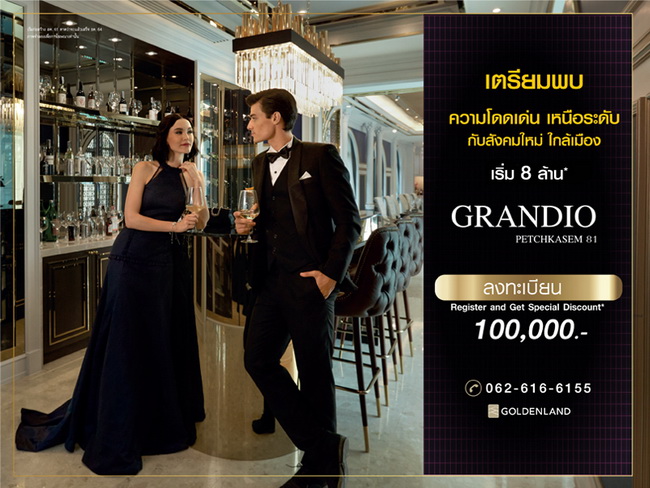โปรโมชั่น: แกรนดิโอ เพชรเกษม 81 เตรียมพบ ความโดดเด่นเหนือระดับ กับสังคมใหม่ ใกล้เมือง A NEW REMARKABLE LIVING AWAITS เริ่ม 8 ล้านบาท* สอบถามข้อมูลเพิ่มเติม โทร. 062-616-6155 ลงทะเบียนรับสิทธิ์พิเศษ 100,000 บาท* ได้ที่นี่