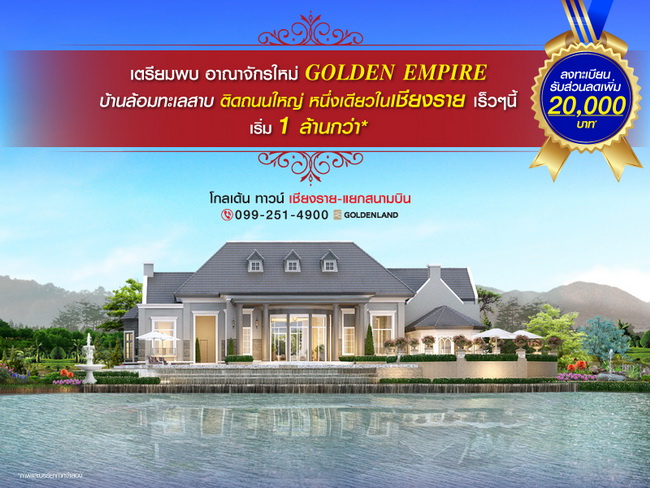 โปรโมชั่น: โกลเด้น ทาวน์ เชียงราย-แยกสนามบิน เตรียมพบ ปรากฎการณ์ครั้งยิ่งใหญ่ บนอาณาจักรใหม่ GOLDEN EMPIRE บ้านล้อมทะเลสาบ ติดถนนใหญ่ หนึ่งเดียวในเชียงราย ใกล้สนามบิน เร็วๆนี้... เริ่มต้นเพียง 1 ล้านกว่าบาท* ลงทะเบียนเตรียมจอง รับส่วนลดเพิ่ม 20,000 บาท* ได้ที่นี่