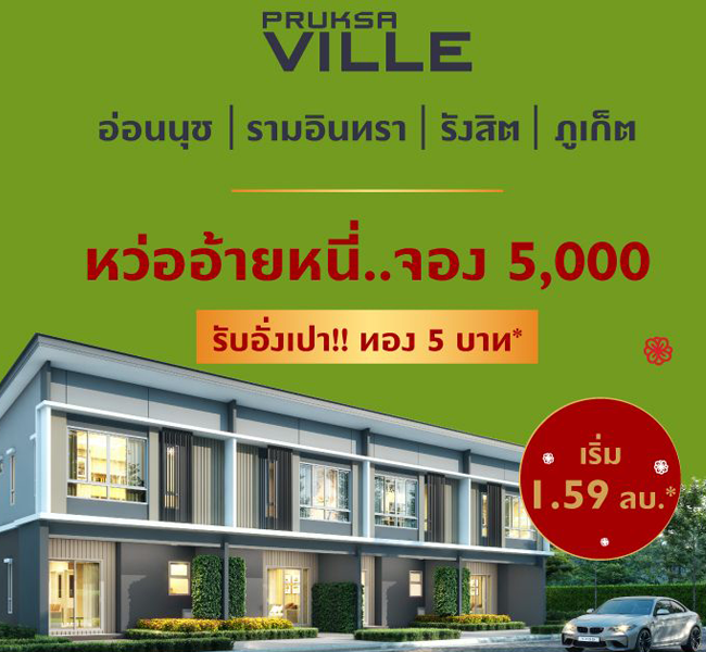 โปรโมชั่น: Pruksa Ville อ่อนนุช | รามอินทรา | รังสิต | ภูเก็ต หว่ออ้ายหนี่.. จอง 5,000 รับอั่งเปา!! ทอง 5 บาท* ราคาเริ่มต้น 1.59 ล้านบาท ลงทะเบียนรับสิทธิพิเศษก่อนใครได้ที่นี่