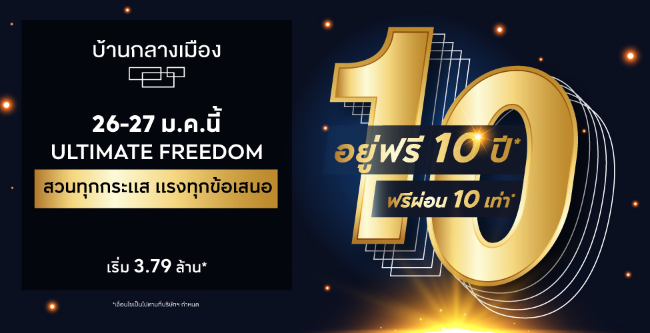 โปรโมชั่น: บ้านกลางเมือง Ultimate Freedom สวนทุกกระแส แรงทุกข้อเสนอ 26 - 27 มกราคม 2562 นี้ อยู่ฟรี 10 ปี* ฟรีผ่อน 10 เท่า* เริ่ม 3.79 ล้านบาท ดูโครงการที่เข้าร่วมและลงทะเบียนได้ที่นี่