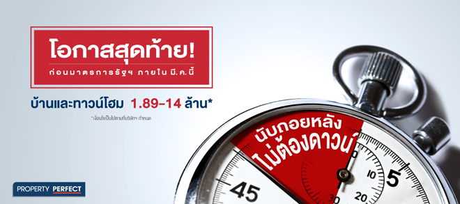 พร็อพเพอร์ตี้ เพอร์เฟค จัดโปรโมชั่นส่งท้ายปี โอกาสสุดท้าย ก่อนมาตรการรัฐฯ รวมบ้าน และทาวน์โฮมกว่า 33 โครงการ ในราคา 1.89-14 ล้านบาท ตั้งแต่วันนี้ - มีนาคม 2562 นี้เท่านั้น พร้อมรับข้อเสนอพิเศษ และโปรโมชั่นพิเศษอีกมากมาย พบกันได้ที่ Sales Gallery ทุกโครงการ
