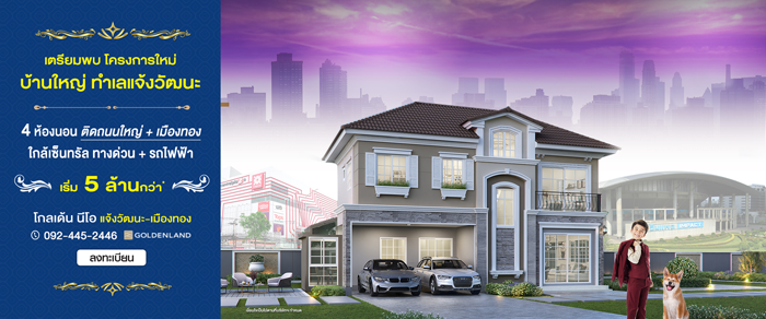 โกลเด้นแลนด์ เปิดให้จอง โกลเด้น นีโอ แจ้งวัฒนะ-เมืองทอง (Golden Neo Chaengwattana - Muangthong) เตรียมพบโครงการใหม่ สุดยอดทำเลแจ้งวัฒนะ เดินทางสะดวก ติดถนนใหญ่ ใกล้ทางด่วน ใกล้อิมแพค และรถไฟฟ้า พบกับบ้านใหญ่ 2 ชั้น 4 ห้องนอน สไตล์อังกฤษ ท่านที่สนใจสามารถลงทะเบียนเพื่อรับส่วนลดเพิ่ม 30,000 บาท* ได้ที่เว็บไซต์ของโกลเด้นแลนด์ค่ะ