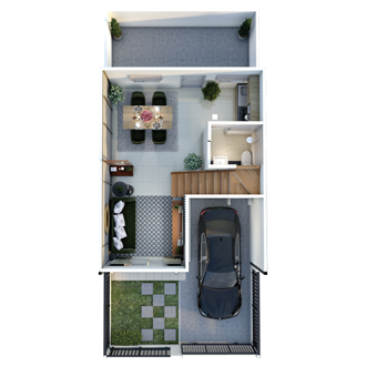 1) แบบบ้าน BLOOM - ทาวน์โฮม 2 ชั้น พื้นที่ใช้สอย 105 ตร.ม. 3 ห้องนอน 2 ห้องน้ำ 1 ห้องรับแขก 1 ห้องรับประทานอาหาร ครัวแยกสัดส่วน เคาน์เตอร์เตรียมอาหาร 1 ที่จอดรถในร่ม