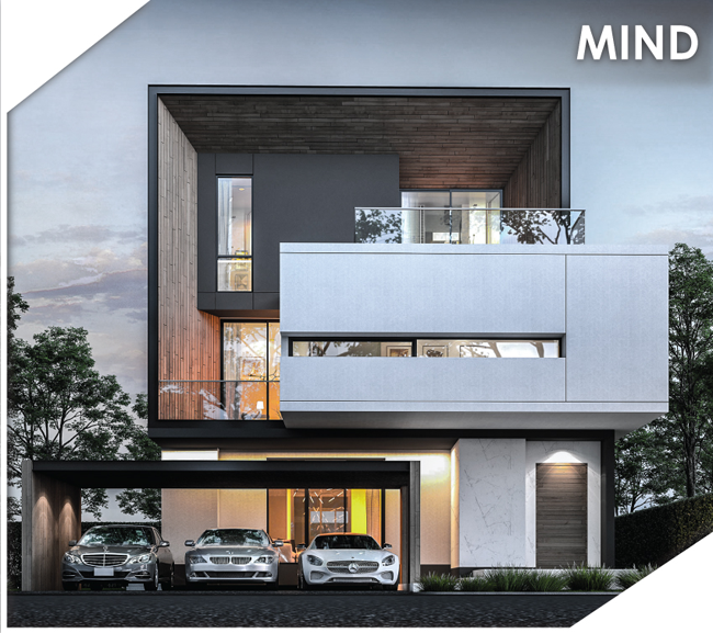2. MIND - บ้านเดี่ยว 3 ชั้น ที่ดินเริ่มต้น 60 ตร.ว. พื้นที่ใช้สอย 370 ตร.ม. ขนาด 4 ห้องนอน 4 ห้องน้ำ 1 ห้องนั่งเล่น 1 ห้องครัว 1 ห้องแม่บ้าน 3 ที่จอดรถ