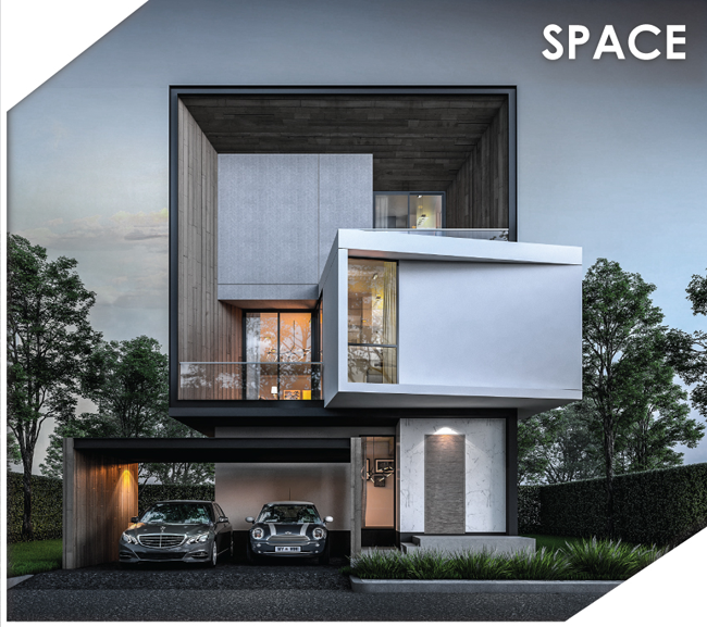 1. SPACE - บ้านเดี่ยว 3 ชั้น ที่ดินเริ่มต้น 57 ตร.ว. พื้นที่ใช้สอย 300 ตร.ม. ขนาด 3 ห้องนอน 3 ห้องน้ำ 1 ห้องนั่งเล่น 1 ห้องน้ำแขก 1 ห้องครัว 1 ห้องแม่บ้าน 2 ที่จอดรถ