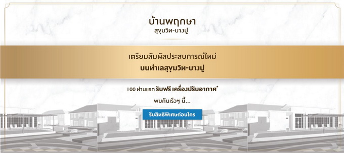 โปรโมชั่น : "บ้านพฤกษา สุขุมวิท - บางปู" เตรียมสัมผัสประสบการณ์ใหม่ บนทำเลสุขุมวิท - บางปู ลงทะเบียนออนไลน์ 100 ท่านแรก รับฟรี! เครื่องปรับอากาศ*