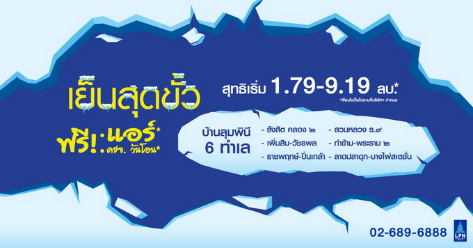 โปรโมชั่น: บ้านลุมพินี บ้านน่าอยู่ จัดโปรฯ "เย็นสุดขั้ว ฟรี! แอร์และค่าใช้จ่ายวันโอนฯ" เริ่ม 1.79 - 9.19 ล้านบาท กับ 6 ทำเล บ้านลุมพินี สวนหลวง ร.๙, บ้านลุมพินี ทาวน์วิลล์ ราชพฤกษ์ - ปิ่นเกล้า, บ้านลุมพินี ทาวน์วิลล์ ลาดปลาดุก - บางไผ่สเตชั่น, บ้านลุมพินี ทาวน์วิลล์ รังสิต คลอง ๒, บ้านลุมพินี ทาวน์วิลล์ เพิ่มสิน - วัชรพล, บ้านลุมพินี ทาวน์พาร์ค ท่าข้าม - พระราม ๒