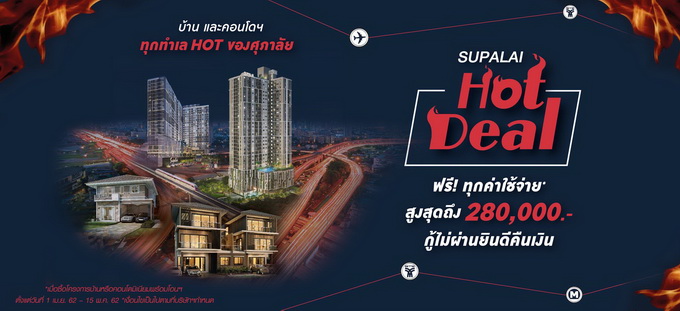 โปรโมชั่น : "SUPALAI HOT DEAL" บ้านและคอนโดทุกทำเล HOT ของศุภาลัย ตั้งแต่วันที่ 1 เมษายน 62 - 15 พฤษภาคม 2562 ฟรี! ทุกค่าใช้จ่าย* สูงสุดถึง 280,000 บาท กู้ไม่ผ่านยินดีคืนเงิน