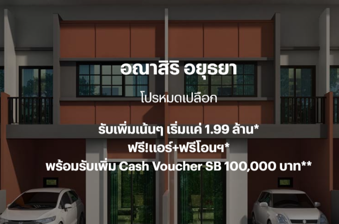 โปรโมชั่น: "อณาสิริ อยุธยา" โปรฯ หมดเปลือก รับเพิ่มเน้นๆ เริ่มแค่ 1.99 ล้านบาท* ฟรี! แอร์ + ฟรีโอนฯ* พร้อมรับเพิ่ม Cash Voucher SB 100,000 บาท**