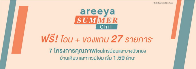 โปรโมชั่น : แคมเปญพิเศษ Areeya Summer Chill ฟรี! โอน + ของแถม 27 รายการ* 7 โครงการคุณภาพ โซนไทรน้อยและบางบัวทอง บ้านเดี่ยวและทาวน์โฮม เริ่ม 1.59 ล้านบาท*