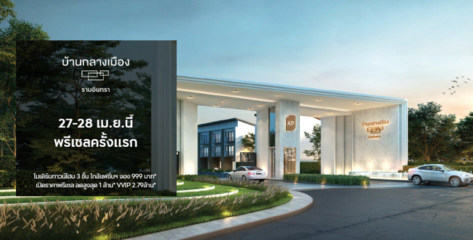 โปรโมชั่น : "บ้านกลางเมือง รามอินทรา" 27 - 28 เมษายน 2562 นี้ พรีเซลครั้งแรก โมเดิร์นทาวน์โฮม 3 ชั้น ใกล้แฟชั่นฯ จอง 999 บาท* เปิดราคาพรีเซลสุดพิเศษ ลดเฉพาะวันงานสูงสุด 1 ล้านบาท* VVIP พิเศษ 2.79 ล้านบาท* (จากปกติ 3.79 ล้านบาท)