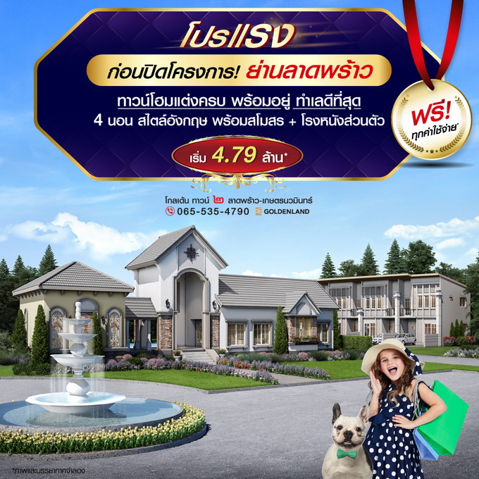 โปรโมชั่น: "โกลเด้น ทาวน์ ๒ ลาดพร้าว-เกษตรนวมินทร์" โปรฯ แรง! ก่อนปิดโครงการ ฟรี! ทุกค่าใช้จ่าย* ทาวน์โฮมแต่งครบ พร้อมอยู่ ทำเลดีที่สุดในโครงการ เดินทางสะดวกใจกลางเมือง ย่านลาดพร้าว&เกษตรนวมินทร์ ใกล้เซ็นทรัลอีสต์วิลล์ เริ่ม 4.79 ล้าน*