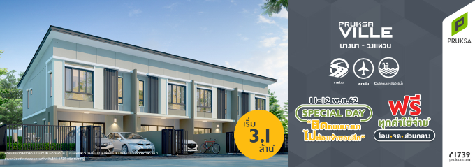 โปรโมชั่น : Pruksaville 6 โซนคุณภาพ 18-19 พ.ค. 62 นี้ Special Day จอง 999 ฟรีทุกค่าใช้จ่าย* เริ่ม 1.69 ล้านบาท* พบกันที่ Sales Gallery Pruksa Ville ทั้ง 6 ทำเลคุณภาพ พระราม 5, พระราม 2, บางนา, เพชรเกษม, ศาลายา และเชียงใหม่ ลงทะเบียนเพื่อรับสิทธิพิเศษก่อนใครได้ที่นี่