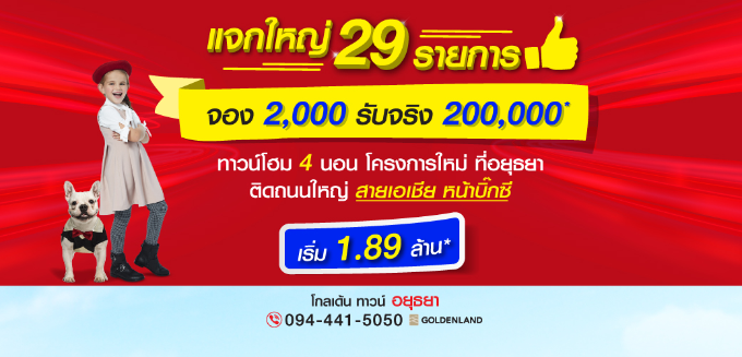 โปรโมชั่น: "โกลเด้น ทาวน์ อยุธยา" แจกใหญ่ แจกจริง 29 รายการ!! พิเศษ จอง 2,000 รับคืน 2 แสน* ทาวน์โฮม โครงการใหม่ที่อยุธยา ติดถนนใหญ่สายเอเชีย หน้าบิ๊กซี มาพร้อมฟังก์ชัน 4 ห้องนอน 3 ห้องน้ำ สไตล์อังกฤษ อลังการสโมสร+โรงหนังส่วนตัว พร้อมห้องพระและครัวไทย เริ่มต้นเพียง 1.89 ล้าน*