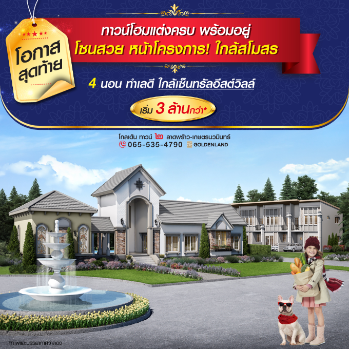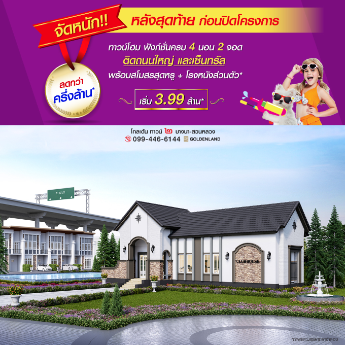 โปรโมชั่น: "โกลเด้น ทาวน์ ๒ บางนา-สวนหลวง" จัดหนัก!! ลดกว่า ครึ่งล้าน* หลังสุดท้าย ก่อนปิดโครงการ เริ่ม 3.99 ล้าน* ทาวน์โฮมพร้อมอยู่ ฟังก์ชันครบ 4 ห้องนอน 2 ที่จอดรถ สไตล์อังกฤษ อลังการสโมสร พร้อมครัวไทย+โรงหนังส่วนตัว ทาวน์โฮม ทำเล บางนา-สวนหลวง พร้อมอยู่ ติดถนนใหญ่ ใกล้เมกาบางนา