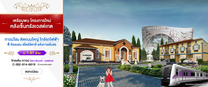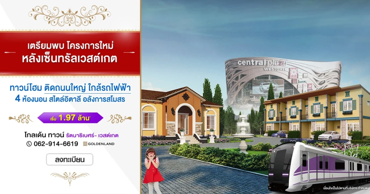 โกลเด้น ทาวน์ รัตนาธิเบศร์-เวสต์เกต (Golden Town Rattanathibet-Westgate) เตรียมพบ โครงการใหม่ ทำเลสุดฮอต หลังเซ็นทรัลเวสต์เกต!! ทาวน์โฮม สไตล์อิตาลี ติดถนนใหญ่ ใกล้รถไฟฟ้า คุ้มสุดๆ กับฟังก์ชัน 4 ห้องนอน 2 ที่จอดรถ อลังการสโมสร พิเศษ! ท่านที่สนใจสามารถลงทะเบียนเพื่อรับส่วนลดเพิ่ม 20,000 บาท* ได้ที่เว็บไซต์ของโกลเด้นแลนด์ค่ะ