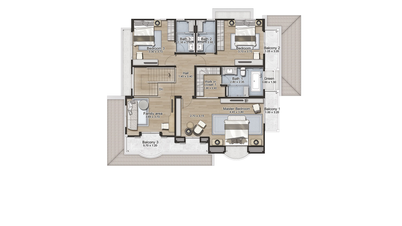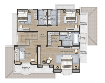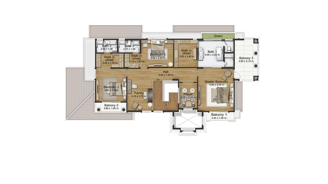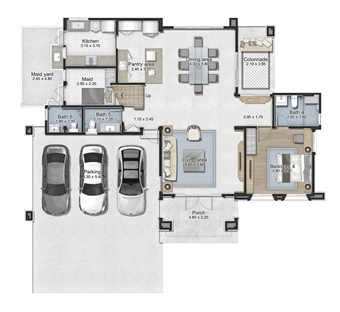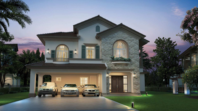 2. แบบบ้าน Grandiose - บ้านเดี่ยว 2 ชั้น พื้นที่ใช้สอย 338 ตร.ม. ขนาดที่ดิน 85 ตร.ว. ขึ้นไป ห้องนอน 4 ห้อง ห้องน้ำ 5 ห้อง ห้องพักผ่อน 1 ห้อง ห้องคนรับใช้ 1 ห้อง ห้องพระ 1 ห้อง ที่จอดรถ 3 คัน