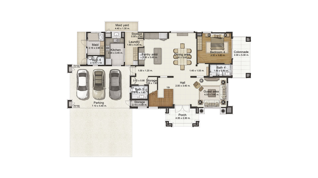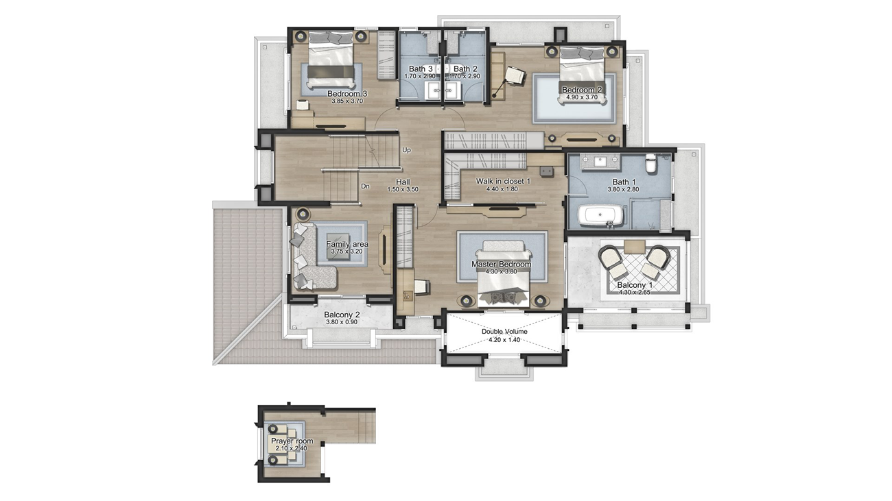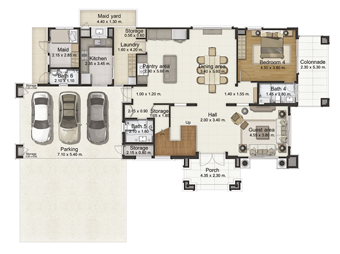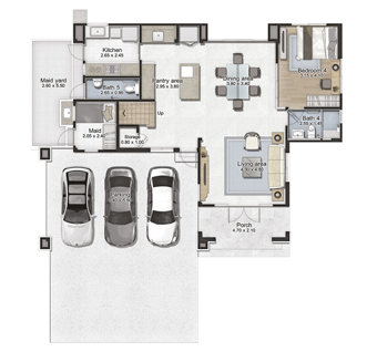 3. แบบบ้าน Prudento-A - บ้านเดี่ยว 2 ชั้น พื้นที่ใช้สอย 403 ตร.ม. ขนาดที่ดิน 85 ตร.ว. ขึ้นไป ห้องนอน 4 ห้อง ห้องน้ำ 5 ห้อง ห้องพักผ่อน 1 ห้อง ห้องคนรับใช้ 1 ห้อง ห้องทำงาน 1 ห้อง ที่จอดรถ 3 คัน