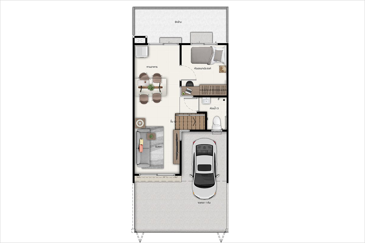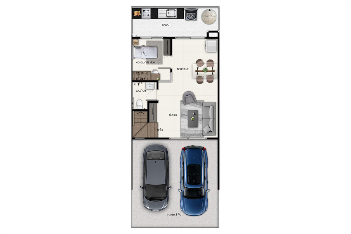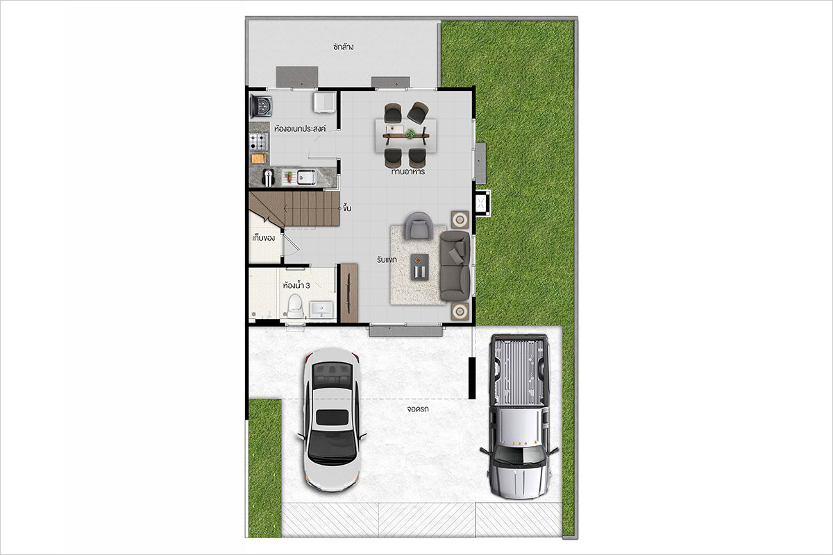 3. Black Rice (หอมนิล) - บ้านแฝด พื้นที่ใช้สอย 127 ตร.ม. ประกอบด้วย 3 ห้องนอน 3 ห้องน้ำ 1 ห้องรับแขก ส่วนรับประทานอาหาร ห้องครัวไทย และที่จอดรถ 2 คัน*