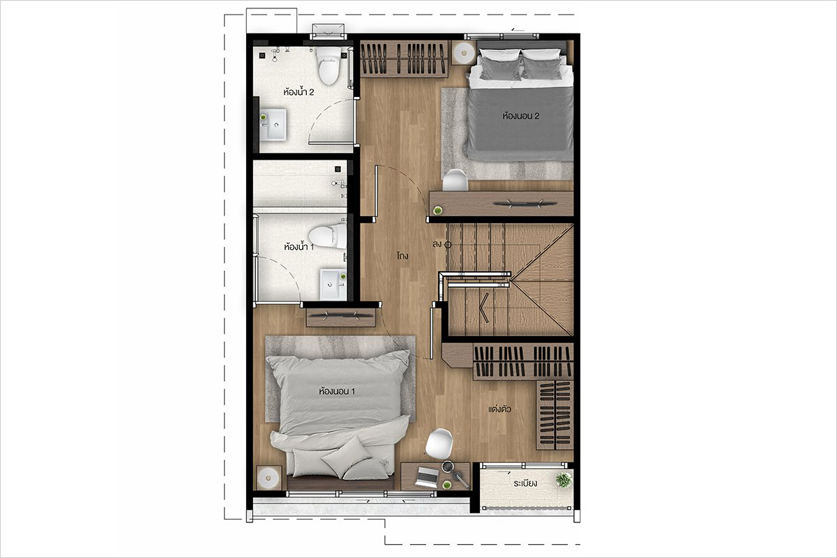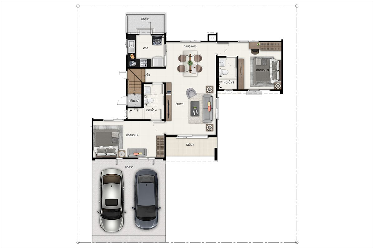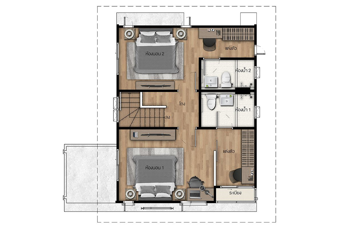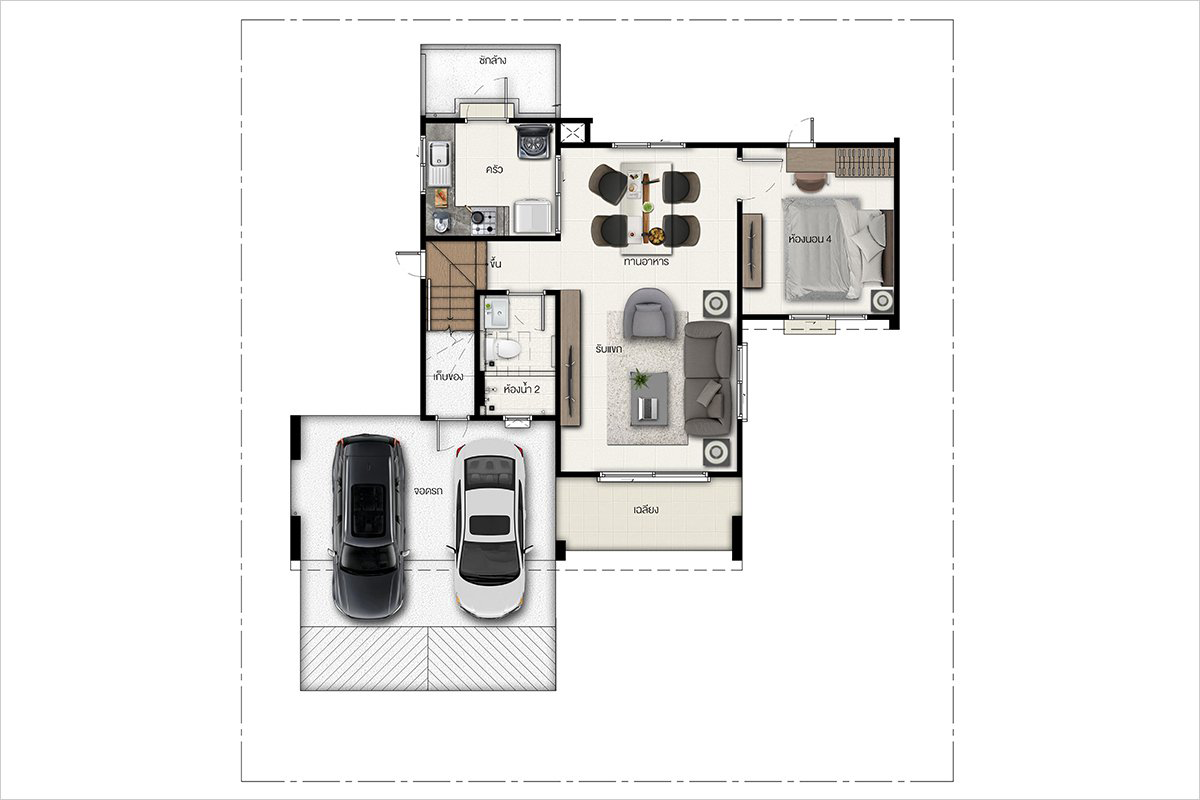 4. Jasmine rice (หอมมะลิ) - บ้านเดี่ยว พื้นที่ใช้สอย 127 ตร.ม. ประกอบด้วย 3 ห้องนอน 3 ห้องน้ำ 1 ห้องรับแขก ส่วนรับประทานอาหาร ห้องครัวไทย และที่จอดรถ 2 คัน*