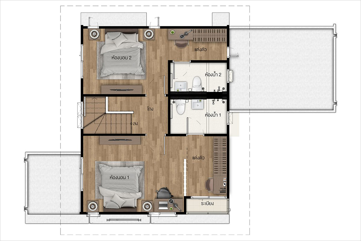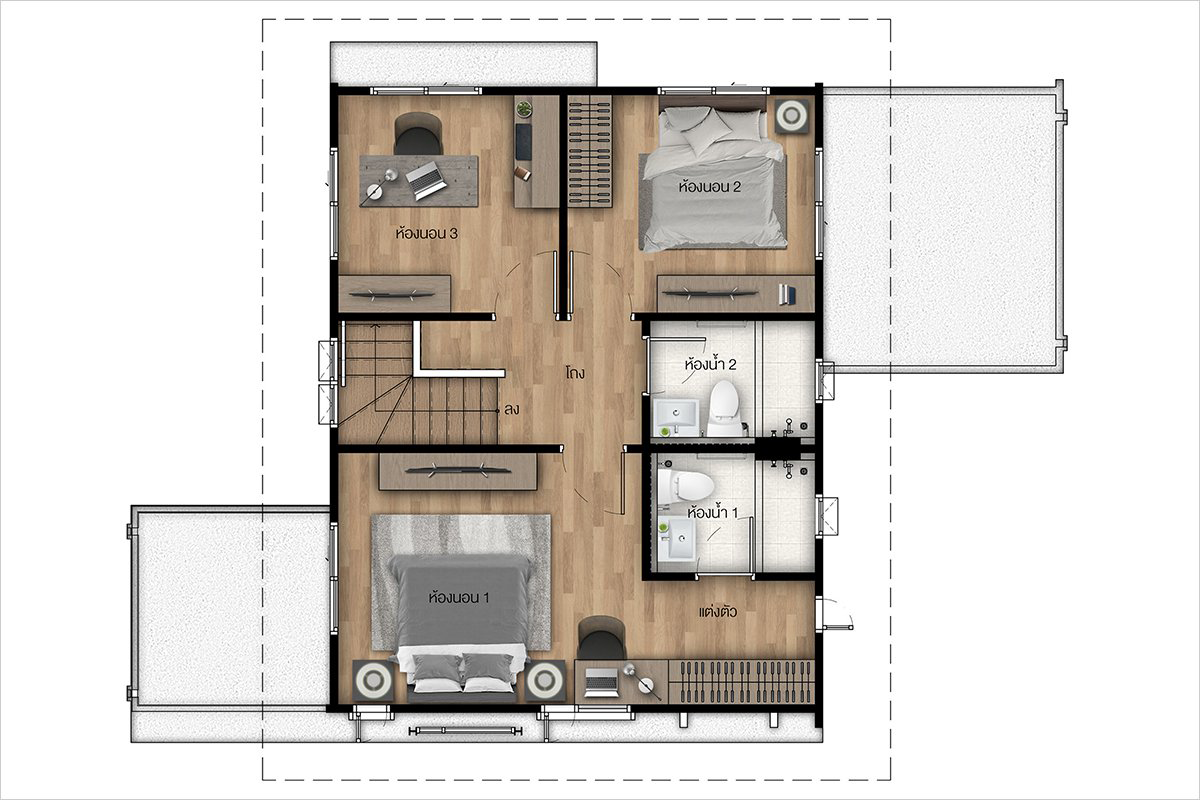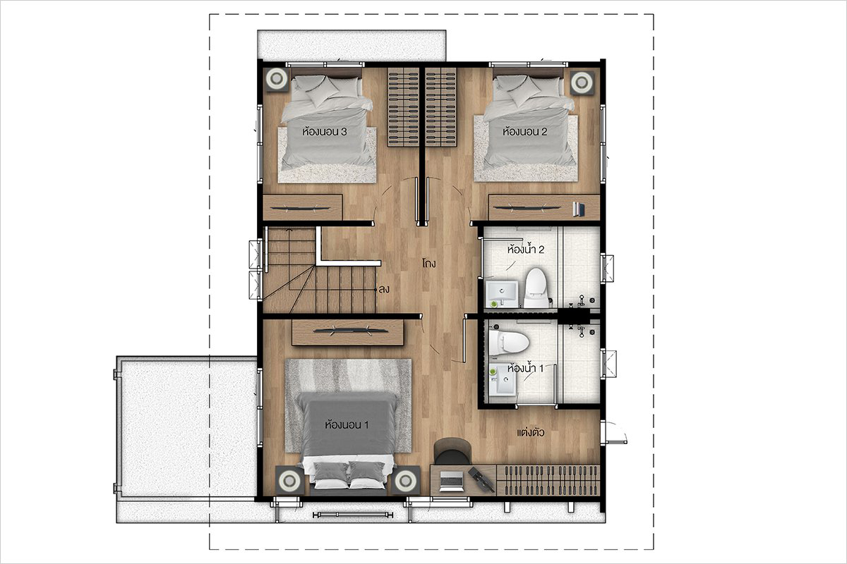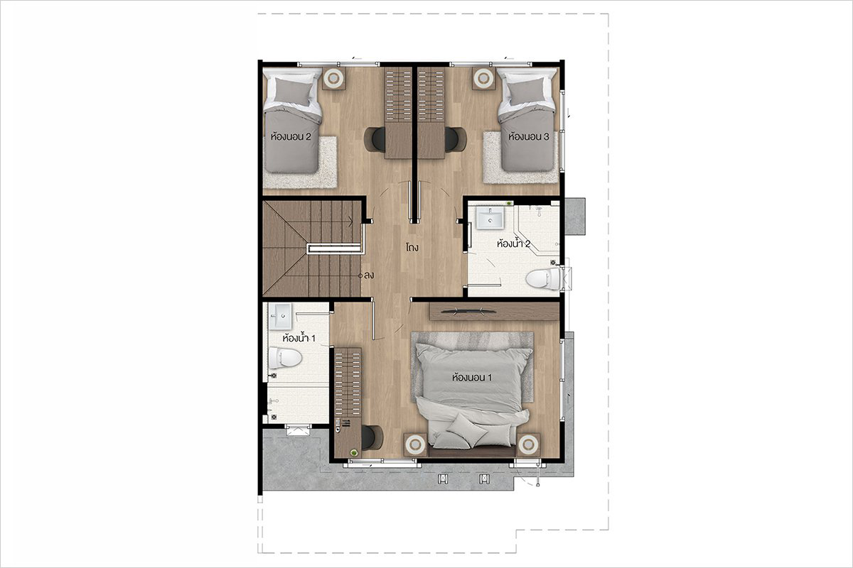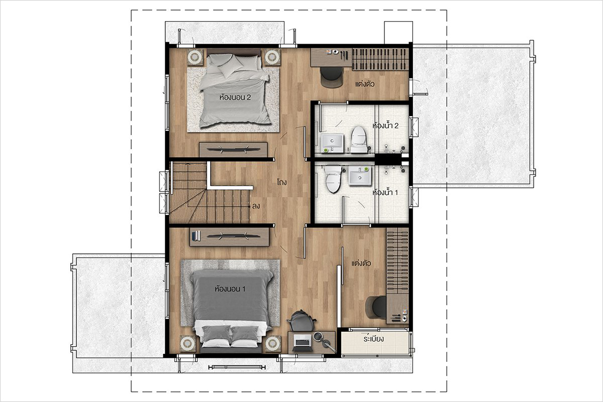 4. Jasmine rice (หอมมะลิ) - บ้านเดี่ยว พื้นที่ใช้สอย 127 ตร.ม. ประกอบด้วย 3 ห้องนอน 3 ห้องน้ำ 1 ห้องรับแขก ส่วนรับประทานอาหาร ห้องครัวไทย และที่จอดรถ 2 คัน*
