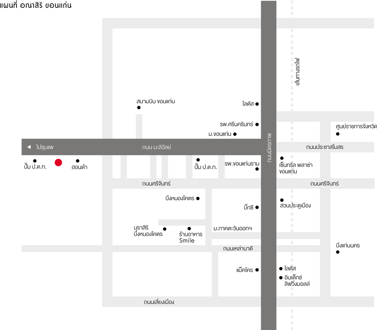 โครงการตั้งอยู่ ถนนมะลิวัลย์ ตำบลบ้านทุ่ม อำเภอเมือง จังหวัดขอนแก่น 40000 ทำเลดี เชื่อมต่อทุกจุดหมายได้อย่างง่ายดาย ติดถนนใหญ่ ใกล้สนามบิน ให้คุณเชื่อมต่อทุกจุดหมายได้อย่างง่ายดาย