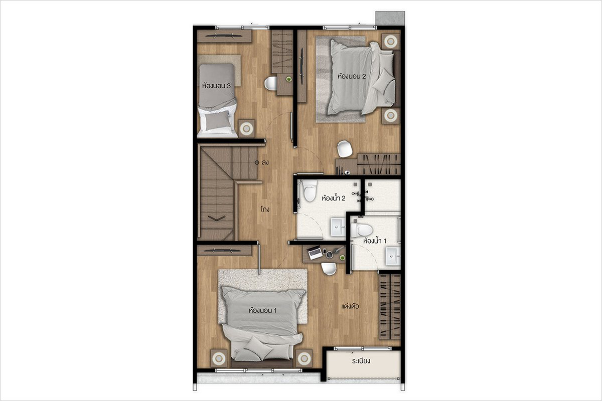2. Moonlight Rice (หอมจันทร์) - ทาวน์เฮ้าส์ พื้นที่ใช้สอย 133 ตร.ม. ประกอบด้วย 4 ห้องนอน, 3 ห้องน้ำ, 1 ห้องรับแขก, ส่วนรับประทานอาหาร และที่จอดรถ 2 คัน*