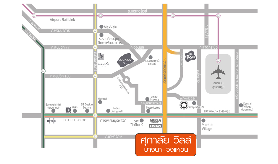 พร้อมให้ผู้พักอาศัยเริ่มต้นวันใหม่กับทุกการเดินทางที่สะดวกสบายบนทำเลคุณภาพ Begin on Best Location โซนบางนา - ตราด เชื่อมต่อทั้งถนนกิ่งแก้วและถนนกาญนาภิเษก (วงแหวนรอบนอก) เชื่อมต่อสู่ใจกลางแหล่งธุรกิจอย่างง่ายดาย ด้วยรถไฟฟ้าถึง 3 สาย ได้แก่ Airport Rail Link ลาดกระบัง BTS สถานีศรีนุช (ในอนาคต) และ LRT บางนา - สุวรรณภูมิ (ในอนาคต) และใกล้ทางด่วนพิเศษบูรพาวิถี และพร้อมให้คุณได้สนุกกับแหล่งช้อป ชิม ชิล มากมาย อาทิ อิเกีย/เมกา บางนา Market Village Bangna สวนหลวง ร.9 บึงหนองบอน โรงเรียนราชวินิต บางแก้ว โรงพยาบาลจุฬารัตน์ 9 และสนามบินสุวรรณภูมิ สำหรับลูกค้าที่สนใจลงทะเบียน Online ผ่านเว็บไซต์ https://www.supalai.com/reg/ville_bangna/ รับทองคำเพิ่มสูงสุด 3 บาท เมื่อจองบ้านภายในงาน