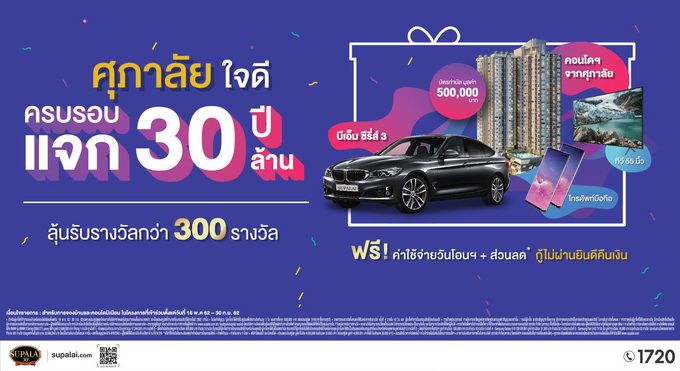 โปรโมชั่น : "ศุภาลัย ใจดี ครบรอบ 30 ปี แจก 30 ล้าน" ลุ้นรับรางวัลกว่า 300 รางวัล ฟรี! ค่าใช้จ่ายวันโอนฯ + ส่วนลด* กู้ไม่ผ่านยินดีคืนเงิน