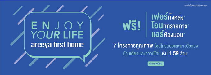 โปรโมชั่น: Enjoy Your Life Areeya First Home ฟรี! เฟอร์ฯ ทั้งหลัง* โอนทุกรายการ* แอร์ห้องนอน* 7 โครงการคุณภาพโซนไทรน้อยและบางบัวทอง บ้านเดี่ยว และทาวน์โฮม เริ่ม 1.59 ล้านบาท*