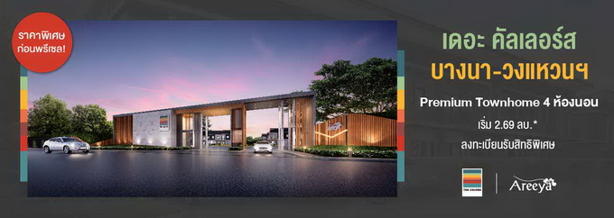 โปรโมชั่น: "เดอะ คัลเลอร์ส บางนา - วงแหวนฯ" Premium Townhome 4 ห้องนอน เริ่ม 2.69 ล้านบาท* ราคาพิเศษก่อนพรีเซล! ลงทะเบียนรับสิทธิพิเศษ