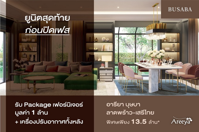โปรโมชั่น: #ยูนิตสุดท้ายก่อนปิดเฟส "อารียา บุษบา ลาดพร้าว-เสรีไทย" รับ Package เฟอร์นิเจอร์ มูลค่า 1 ล้าน* + เครื่องปรับอากาศทั้งหลัง พิเศษเพียง 13.5 ล้านบาท* "อารียา บุษบา ลาดพร้าว-เสรีไทย" โครงการบ้านเดี่ยวลาดพร้าวแห่งเดียวติดถนนเสรีไทย สไตล์ Contemporary ด้วยพื้นที่ใช้สอยกว่า 305 ตารางเมตร รองรับทุกรูปแบบการอยู่อาศัยให้คุณใช้ชีวิตในสังคมมีระดับ เพียง 27 ยูนิตเท่านั้น!! ลงทะเบียนรับโปรโมชั่นที่นี่ https://bit.ly/2KHdgsm