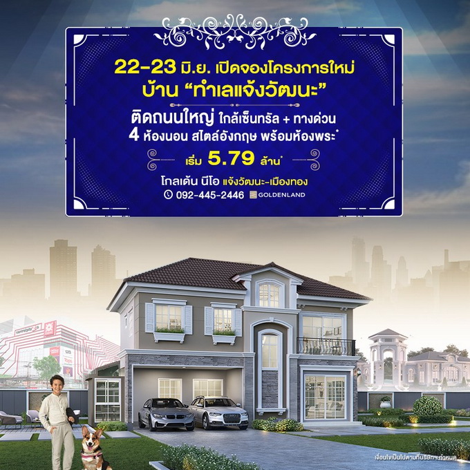 โปรโมชั่น: "โกลเด้น นีโอ แจ้งวัฒนะ-เมืองทอง" 22 - 23 มิ.ย. นี้ เปิดจองโครงการใหม่ "ทำเลแจ้งวัฒนะ" บ้าน สไตล์อังกฤษ ติดถนนใหญ่ ใกล้เซ็นทรัล + ทางด่วน คุ้มกว่าด้วยฟังก์ชันจัดเต็ม 4 ห้องนอน 2 ที่จอดรถ พร้อมห้องพระ* เริ่ม 5.79 ล้าน* ลงทะเบียนออนไลน์รับส่วนลดเพิ่ม 30,000 บาท* http://bit.ly/2TK7QCM