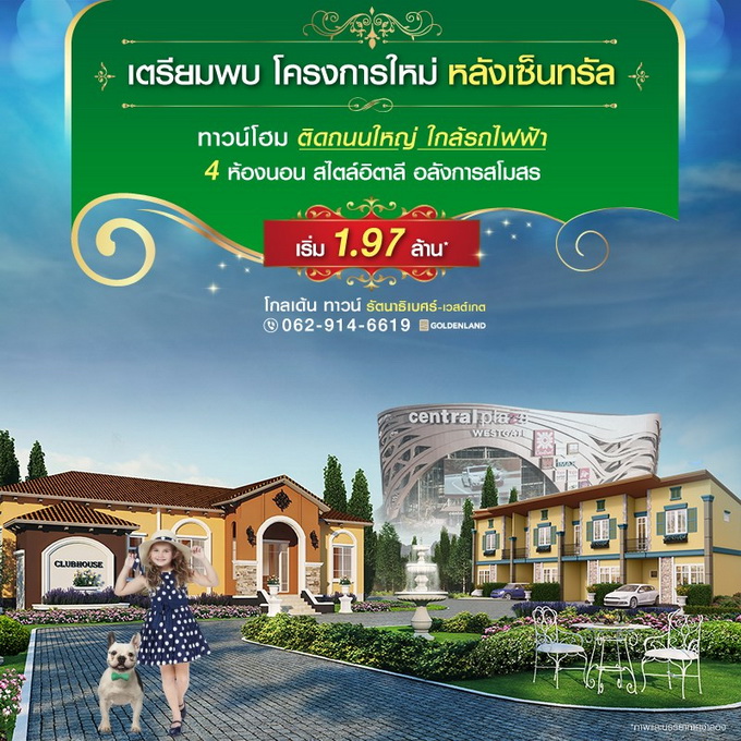 โปรโมชั่น: "โกลเด้น ทาวน์ รัตนาธิเบศร์-เวสต์เกต" ทาวน์โฮมโครงการใหม่ ติดถนนใหญ่ ใกล้รถไฟฟ้า หลังเซ็นทรัล เวสต์เกต ครบทุกฟังก์ชัน 4 ห้องนอน 2 ที่จอดรถ อลังการสโมสร สไตล์อิตาลี เริ่มเพียง 1.97 ล้านบาท* พิเศษ! ลงทะเบียนรับส่วนลดเพิ่ม 20,000 บาท* http://bit.ly/2CraOS1
