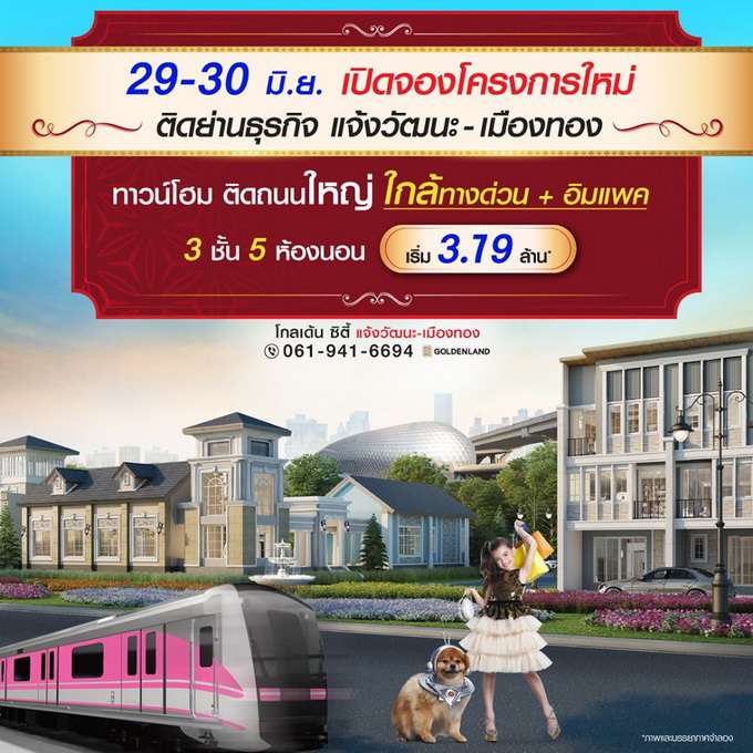 โปรโมชั่น: "โกลเด้น ซิตี้ แจ้งวัฒนะ-เมืองทอง" 29 - 30 มิถุนายน 2562 นี้ เปิดจองโครงการใหม่ บนทำเลการค้าแห่งใหม่ ย่านเมืองทอง ติดถนนใหญ่ ใกล้ทางด่วน+อิมแพค ทาวน์โฮม 3 ชั้น 5 ห้องนอน อลังการสโมสร เริ่มต้นเพียง 3.79 ล้าน* ลงทะเบียนออนไลน์! รับส่วนลดพิเศษเพิ่ม 30,000 บาท* ได้ที่ http://bit.ly/2GZoc3E