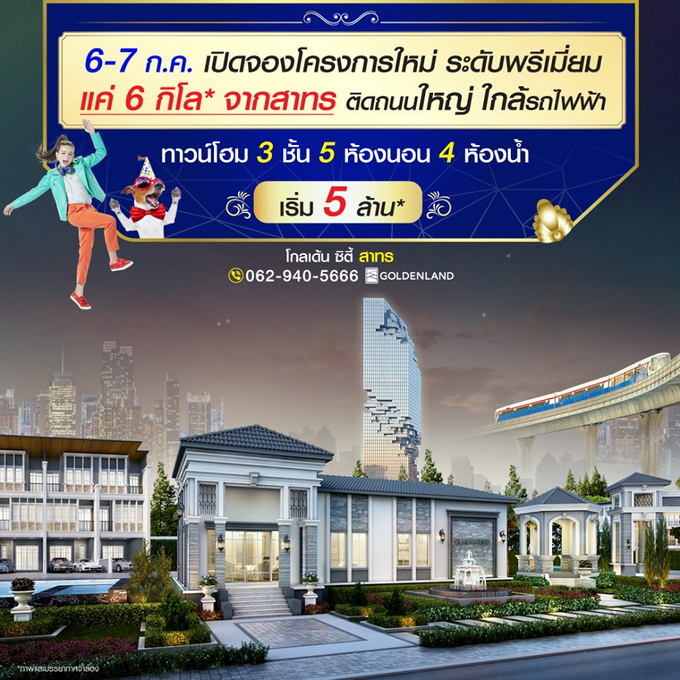 โปรโมชั่น: "โกลเด้น ซิตี้ สาทร" 6 - 7 กรกฎาคม 2562 เปิดจองโครงการใหม่ ระดับพรีเมียมแค่ 6 กิโลเมตร จากสาทร ที่สุดทำเลทอง ใจกลางเมือง ติดถนนใหญ่ ใกล้รถไฟฟ้า เริ่มต้นเพียง 5 ล้าน* รีบลงทะเบียนจองสิทธิ์ รับส่วนลดเพิ่ม 30,000 บาท* ได้ที่ http://bit.ly/2SEamZS