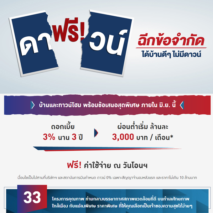 โปรโมชั่น: ฟรี! ดาวน์ ฉีกข้อจำกัด ได้บ้านดีๆ ไม่มีดาวน์ ผ่อนเริ่มล้านละ 3,000 บาท/เดือน* ดอกเบี้ย 3% นาน 3 ปี ฟรี! ค่าใช้จ่ายวันโอน 33 โครงการบ้านและทาวน์โฮม ภายในมิถุนายน 2562 นี้เท่านั้น
