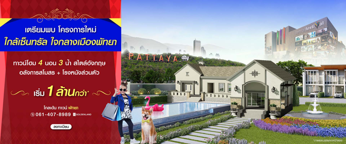 โกลเด้น ทาวน์ พัทยาใต้-สุขุมวิท (Golden Town Pattaya - Sukhumvit) เปิดตัวทาวน์โฮมภาคตะวันออก เตรียมพบโครงการใหม่ ใกล้เซ็นทรัล ใจกลางเมืองพัทยา กับทาวน์โฮมหรู 4 ห้องนอน 3 ห้องน้ำ สไตล์อังกฤษ อลังการสโมสร + โรงหนังส่วนตัว ท่านที่สนใจสามารถลงทะเบียนจองออนไลน์เพื่อรับส่วนลดเพิ่ม 20,000 บาท* ได้ที่เว็บไซต์ของโกลเด้นแลนด์ค่ะ