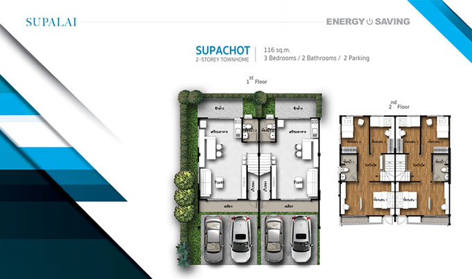 1. ศุภโชติ - ทาวน์โฮม 2 ชั้น พื้นที่ใช้สอย 116 ตร.ม. 3 ห้องนอน 2 ห้องน้ำ ที่จอดรถ 2 คัน