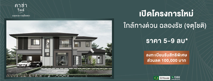 บริษัท ควอลิตี้เฮ้าส์ จำกัด (มหาชน) และบริษัทในเครือ เตรียมเปิดตัวโครงการใหม่ คาซ่า วิลล์ วงแหวน - รามอินทรา (Casa Ville Wongwan - Ramintra) บ้านเดี่ยว 2 ชั้น บนทำเลศักยภาพ ให้คุณใช้ชีวิตสะดวกยิ่งขึ้น ใกล้ทางด่วน ฉลองรัช (จตุโชติ) ผู้ที่สนใจสามารถลงทะเบียนเพื่อรับสิทธิพิเศษและส่วนลด 100,000 บาท ได้ที่เว็บไซต์ของควอลิตี้เฮ้าส์