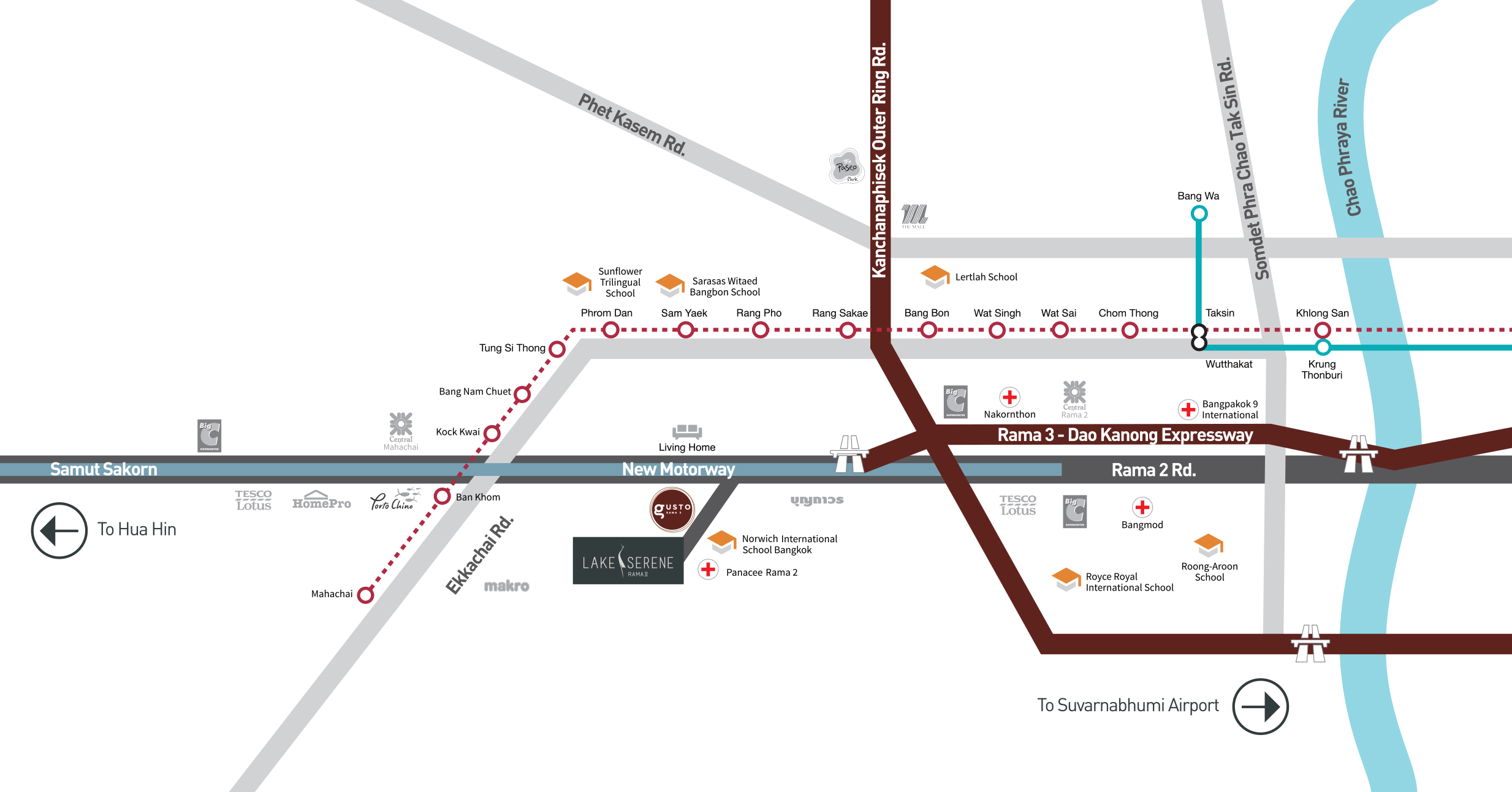 โครงการตั้งอยู่ตำบลบางน้ำจืด อำเภอเมืองสมุทรสาคร จังหวัดสมุทรสาคร เดินทางเข้า-ออกเมืองสะดวกด้วยทางด่วนเฉลิมมหานคร พร้อมทางด่วนกาญจนาภิเษก ทางยกระดับและรถไฟฟ้าสายสีแดงเข้มในอนาคต สะดวกด้วยโรงเรียนนานาชาติ และ Medical Center ในโครงการ และคอมมูนิตี้มอลล์แห่งใหม่หน้าโครงการ
