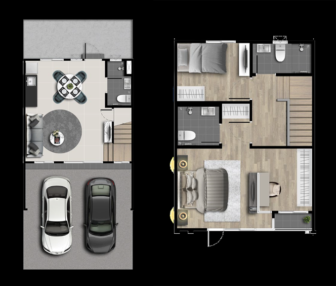 แบบบ้าน Mira - ทาวน์โฮม 2 ชั้น หน้ากว้าง 5.5 เมตร ที่ดินเริ่มต้น 17.5 ตร.ว. พื้นที่ใช้สอย 105.42 ตร.ม. 2 ห้องนอน 3 ห้องน้ำ ที่จอดรถ 2 คัน